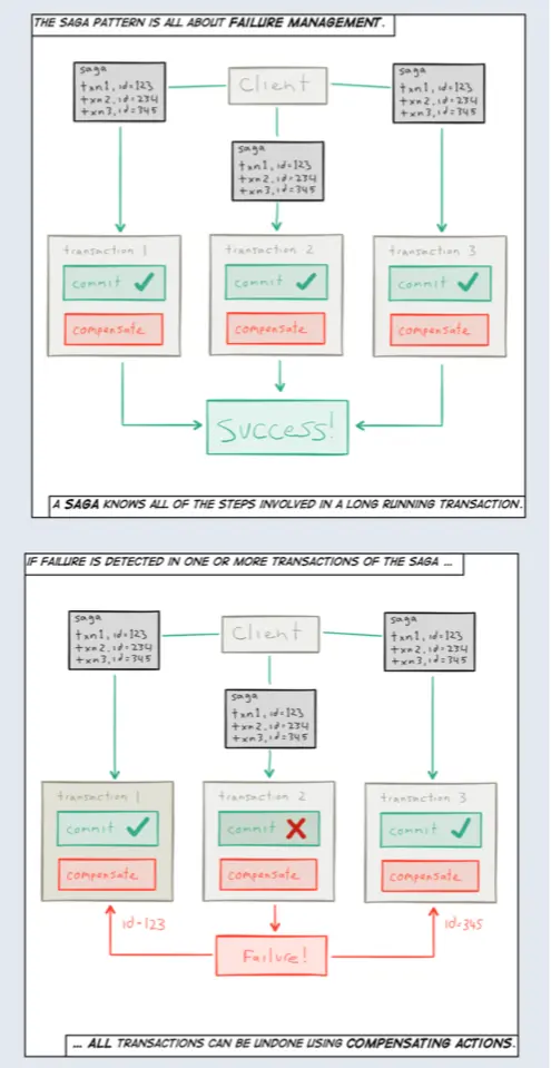 分布式事务是一个经常使用的方式用来协调分布式系统的变动,但其本质需要约束并发执行,保证同一时间只有一个用户在操作。因此其成本非常昂贵,会使得系统变慢、无法扩展。Saga模式是分布式事务之外的一个能够实现可扩展、弹性伸缩的选择。它的理论基础在于一个长时间运行的业务事务大多时候都是由多个事务步骤组成的,而事务步骤的总体一致性能够通过将这些步骤分组成一个总体的分布式事务来实现。该技术将每一个阶段的事务与一个可补偿回滚的事务配对,如果一个阶段的事务失败了,那么总体的分布式事务就可以回滚(反向顺序)。