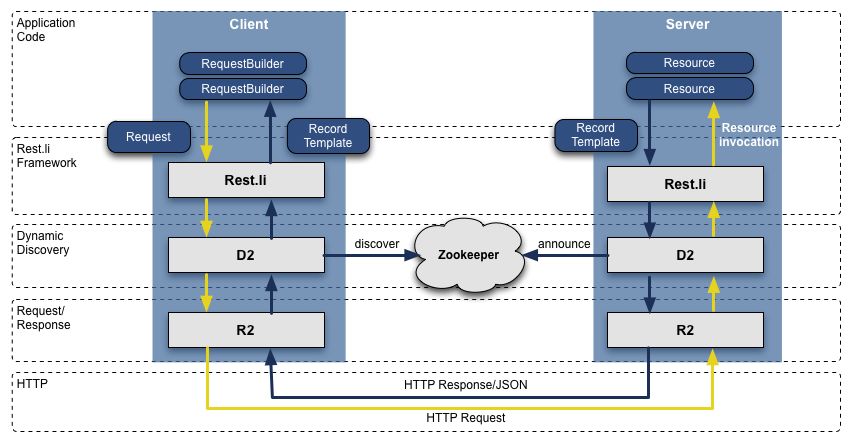 Node.js 和 C++的客户端,可能是自己开发的或者收购过来的。 脱离了RPC也让我们将变现层和后端兼容型的问题中挣脱出来。另外, 使用Dynamic Discovery (D2)的Rest.li, 我们可以得到自动的基于负载均衡,服务发现和可扩展的API客户端。今天, LinkedIn有975 个Rest.li资源, 所有的数据中心每天有超过一千亿级Rest.li调用。
