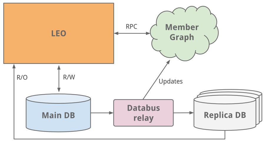 随着站点的增长, Leo系统也在扩大, 增加了更多的角色和职能, 也更加复杂。 通过负载均衡可以运行多个Leo实例,但是新增的负载也影响到LinkedIn的最关键系统-会员信息数据库。