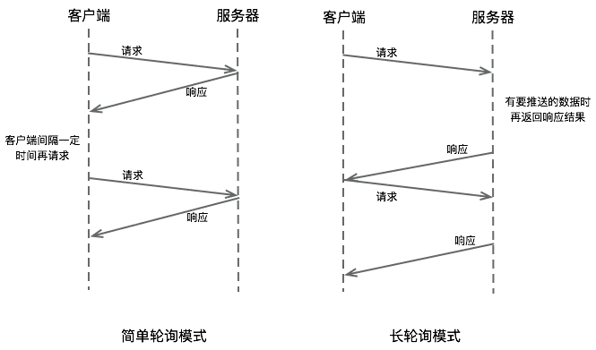 长轮询是再此基础上的一种改进。客户端发起请求后,服务端会保持住该连接,直到后端有数据更新后,才会将数据返回给客户端;客户端在收到响应结果后再次发送请求,如此循环往复。关于简单轮询与长轮询的区别,一图胜千言: