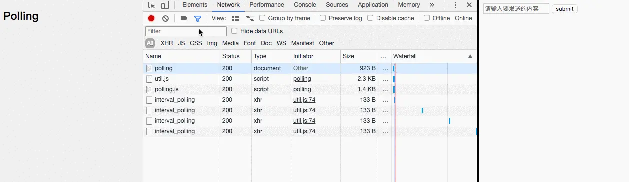 轮询开始时,向后端发送请求,待响应结束后,间隔一定时间再去请求数据,如此循环往复。效果如下: