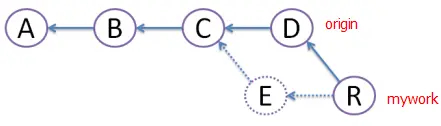 创建一个新的提交R,R的文件内容和上面M的一样,但我们将E提交废除,当它不存在(图中用虚线表示)。由于这种删除,小李不应该push其他的repository.rebase的好处是避免了菱形的产生,保持提交曲线为直线,让大家易于理解。