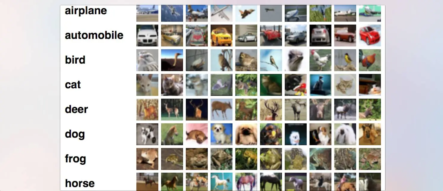 CIFAR-10 数据集由 60000 张 32x32 10 类彩色图片,每一个类别都有 6000 张图片。该数据集包含了 50000 张训练集和 10000 张测试集。