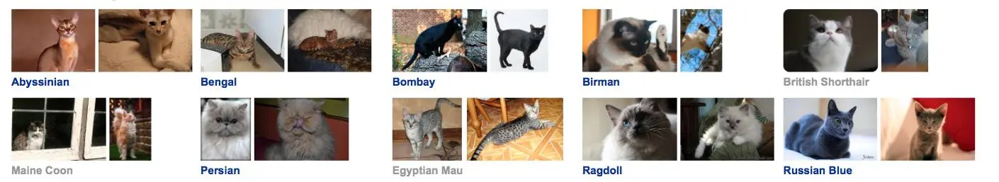 该数据集有 25 种狗和 12 种猫。每一种类别有 200 张相片。我们在该项目中只会使用 10 种猫。