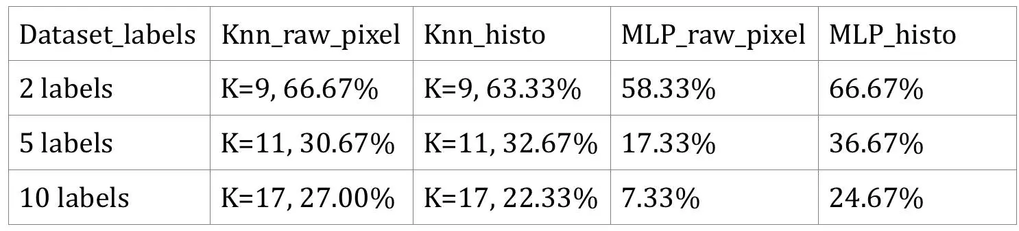 - 在神经网络 MLP 分类器中,原始像素精确度远低于直方图。对于整个数据集(10 个标签),原始像素精确度甚至低于随机猜测。