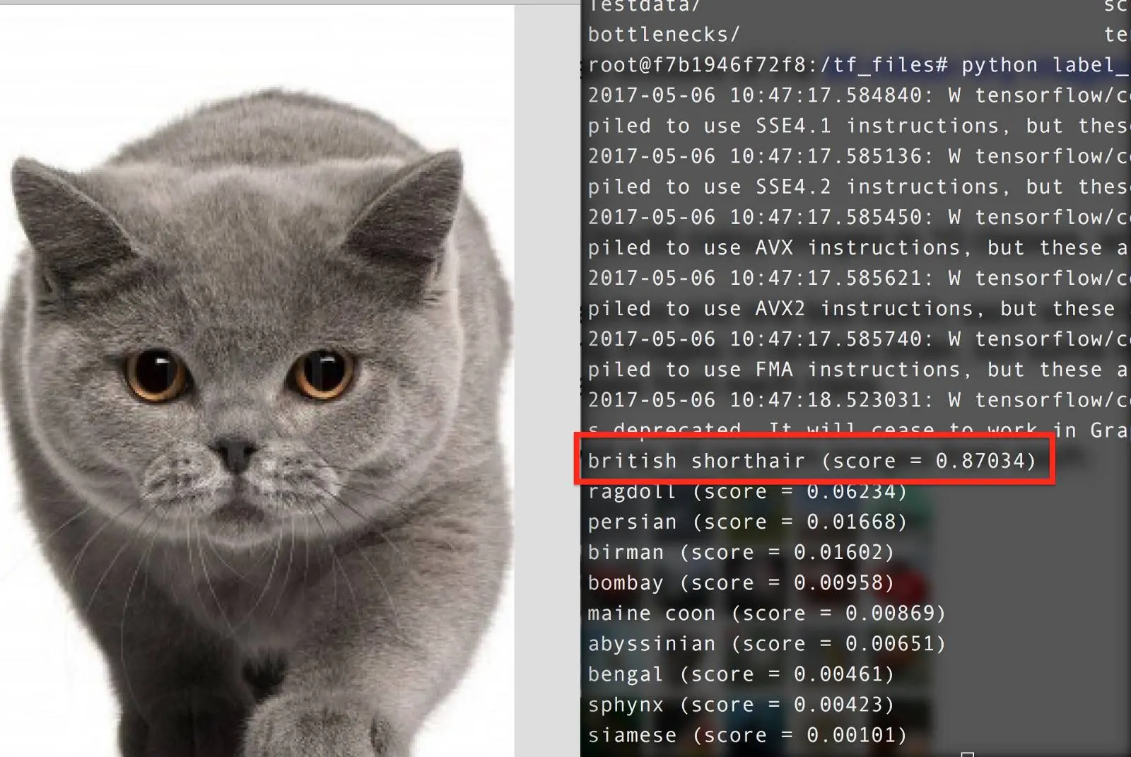 首先我们需要获取预训练模型,并移除旧的顶层神经网络,然后再基于我们的数据集重新训练一个输出层。虽然猫的所有品种并没有在原始 ImageNet 数据集和全训练的模型中体现,但迁移学习的神奇之处就在于其可以利用已训练模型用来识别某些目标的底层特征,因为底层特征可以在很多不更改的情况下应用于很多识别任务。然后我们分析本地的所有图片并计算每张的瓶颈值(bottleneck values)。因为每张图片在训练过程中重复使用了多次,所以计算每个瓶颈值需要花费大量时间,但我们可以加快缓存这些瓶颈值,也就可以省去重复的计算。