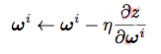 - 关于参数 ωi 的导数用于该层参数更新,η 是每次随机梯度下降的步长,一般随训练轮数(epoch)的增多减小,见公式1.6