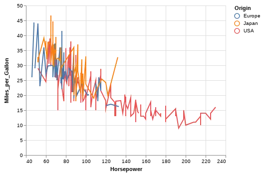 alt.Chart(cars).mark_line().encode( x='Horsepower', y='Miles_per_Gallon', color='Origin',)这里可以注意到无论你的car数据集有多少特征,可视化时你需要什么特征,在encode函数中声明就可以了。当然,Altair API还有许多便捷的地方,许多实例的jupyterNOTEBOOK例子可以先试试。