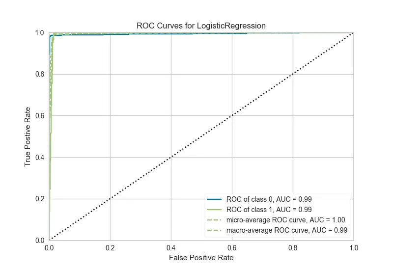 from sklearn.linear_model import LogisticRegressionfrom yellowbrick.classifier import ROCAUC# 初始化分类模型和可视化logistic = LogisticRegression()visualizer = ROCAUC(logistic)visualizer.fit(X_train, y_train) # visualizer对象其实就是estimater类的继承,可以进行fit训练visualizer.score(X_test, y_test) # 在测试集上得分g = visualizer.poof() # 获得ROCAUC的分析图如上述代码,在logistic回归模型训练完毕就立即输出分析图: