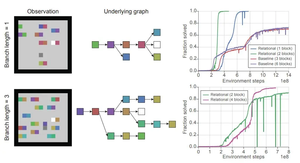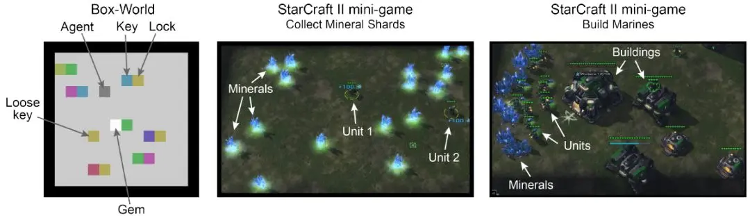 我们的成果如下:(1)我们创建并分析了一个名为「方块世界」的 RL 任务,该任务以关系推理为明确目标,并证明了具有利用基于注意力的非局部计算来生成关系表征能力的智能体 [14] 与不具备这种能力的智能体相比,表现出有趣的泛化行为;(2)我们将这种智能体应用于一个难题——「星际争霸 II」小游戏 [15]——并在 6 个小游戏上达到了当前最优水平。