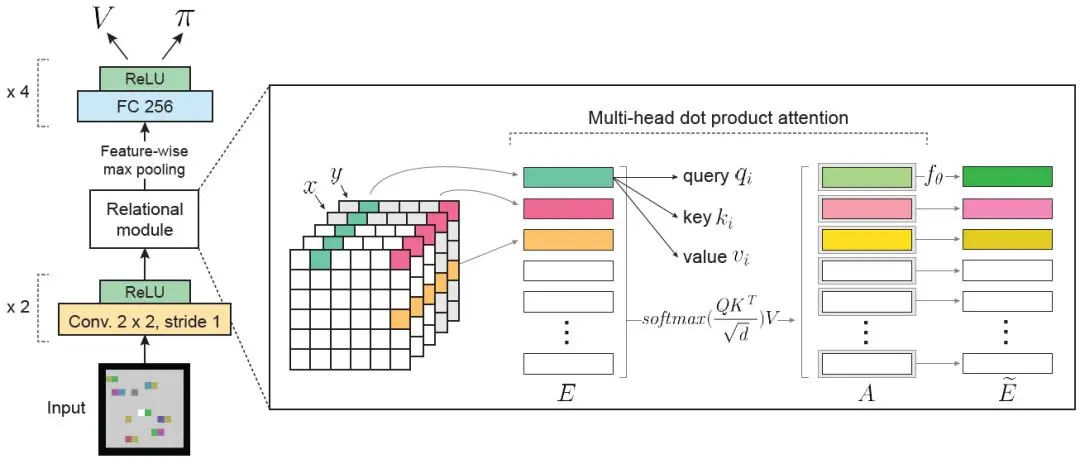 神经网络传统上就与属性-值、命题性以及强化学习方法 [19] 联系在一起。现在,研究者们将 RRL 的核心思想转化为深度 RL 智能体中结构化指定的归纳偏置,他们使用神经网络模型在结构化的情景表征(实体集合)上执行运算,并通过迭代的方式进行关系推理。其中实体对应着图像的局部区域,且智能体将学习注意关键对象并计算他们成对和更高阶的交互。