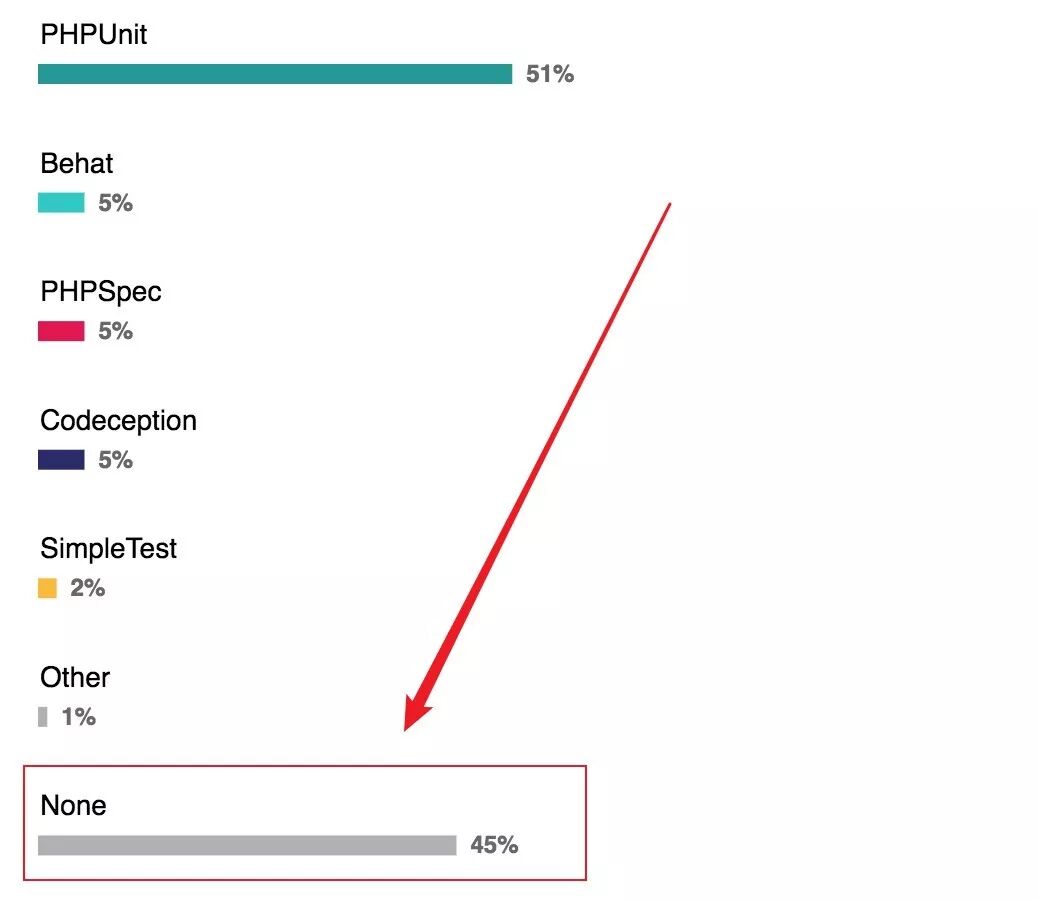 PHPUnit这个老牌的测试框架依然位居榜首,很有意思的是不用测试框架的人仍然占比45%,这更多是PHP开发模式决定的。