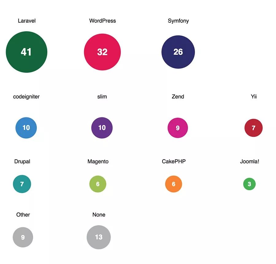 Laravel依然迅猛,和去年44%的占有率基本持平,今年多了一匹黑马slim(一个轻量的PHP框架),从去年2%杀到今年10%。