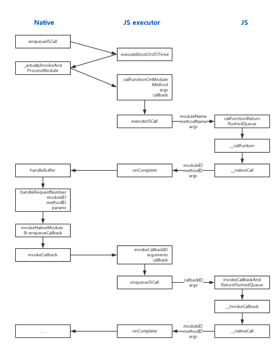 综上所述,在JS端提供callFunctionReturnFlushedQueue,Native bridge调用JS端方法时,应该使用这个方法。查看Native代码实现可知,RCTBridge封装了enqueueJSCall方法调用JS,梳理Native->JS的整体交互流程如下图所示。