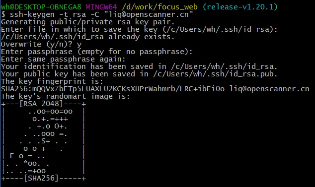 执行命令后需要进行3次或4次确认:确认秘钥的保存路径(如果不需要改路径则直接回车);如果上一步置顶的保存路径下已经有秘钥文件,则需要确认是否覆盖(如果之前的秘钥不再需要则直接回车覆盖,如需要则手动拷贝到其他目录后再覆盖);创建密码(如果不需要密码则直接回车);确认密码;