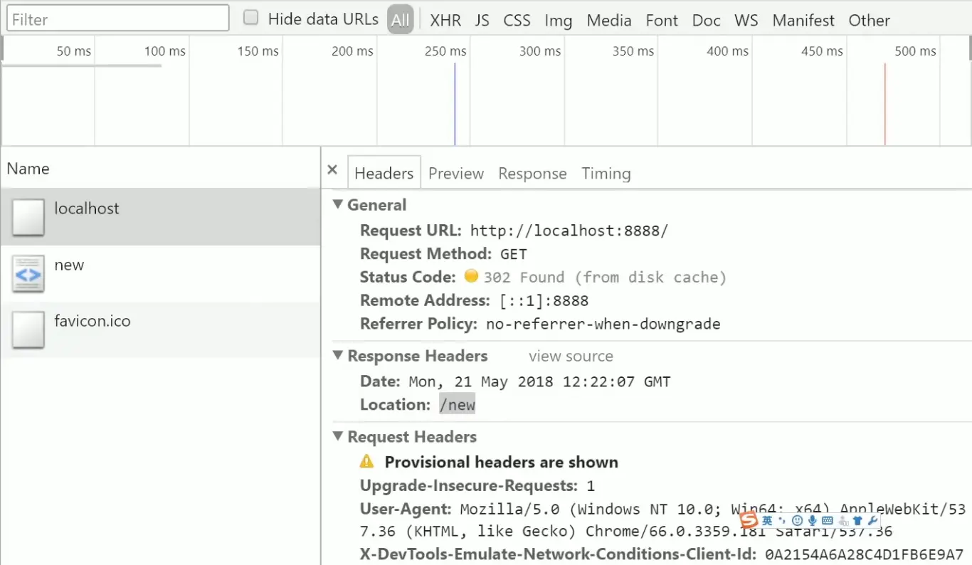 图中可以看到第一次请求页面状态码为302,并跳转到了new这个url下。