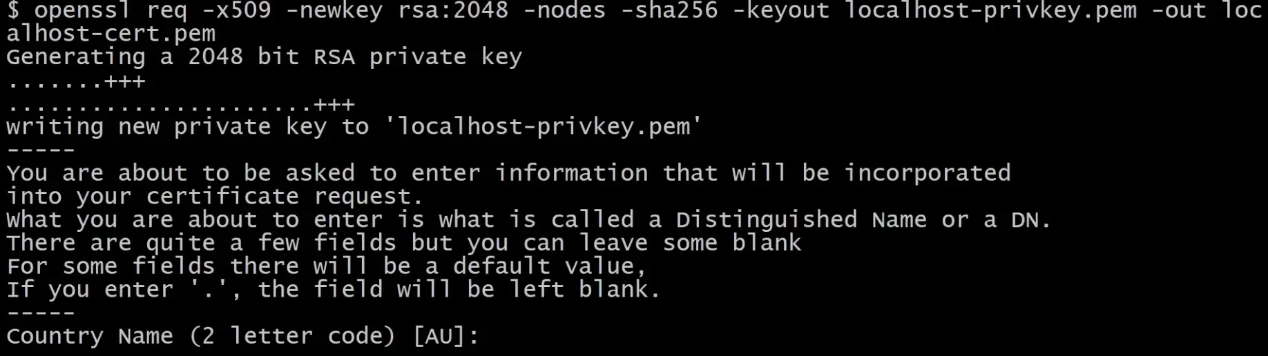 openssl req -x509 -newkey rsa:2048 -nodes -sha256 -keyout localhost-privkey.pem -out localhost-cert.pem