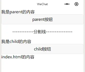 这里的custom-li对应本文的是child组件,也就说说通过getRelationNodes方法可以拿到组件已经关联了的节点,这就好办了,拿到对应的节点就可以调用setData方法设置关联节点的属性值,即nodes.setData({}),这样就达到了父子组件通信的目的,对应本文,点击页面中的按钮,可以将parent组件的"hello child"传给child,或者将child组件的"hello parent"传给parent,效果如下: