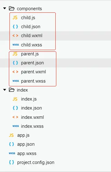 新建一个小程序项目,目录结构如下,(index页面,作为首页;components文件夹存放组件,在里面建parent父组件和child子组件)。