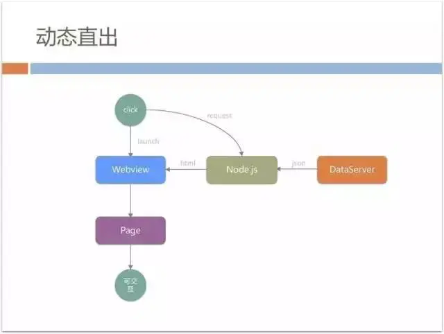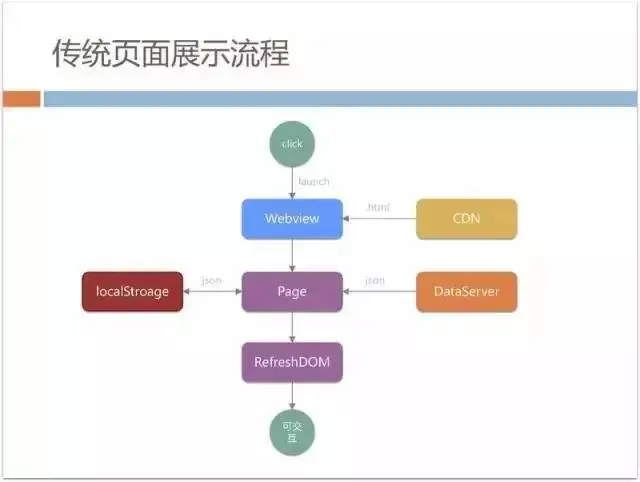 这里的流程大概如下,用户从click开始,到launch WebView,WebView去加载CDN上的HTML文件,页面loading起来后才会去获取JSON,为了加速这个过程可能会用到localStroage做缓存,这整个过程是非常传统的静态页面加载过程,相对比较简单。