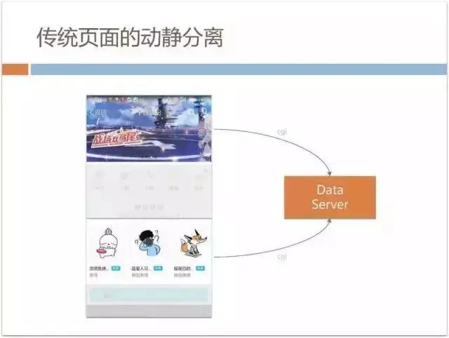 这些页面相对传统,在最初的时候,一个传统的H5页面为了提升速度和体验会做一些动静分离的优化,比如页面顶部的banner以及下面我们称作为item的物品区域,这些区域的数据可以由产品经理自由编辑随时更换,我们会通过页面loading之后发起CGI请求,从dataServer获取数据,然后再拼接起来。