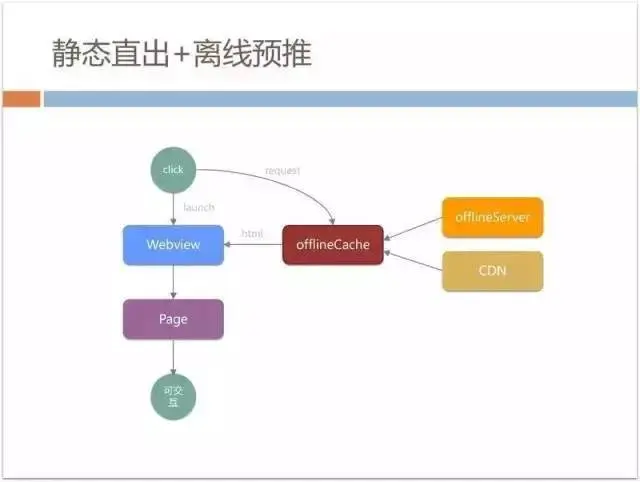如果offlineCache没有缓存才会去offlineServer去同步文件,同时也会去从CDN去下载更新。我们在CDN上存储的HTML已经把banner和item等所有的数据打在静态页面里,这个时候WebView只要拿到HTML就不需要再做refresh和执行任何JS,整个页面可以直接展示出来,用户也可以进行交互。