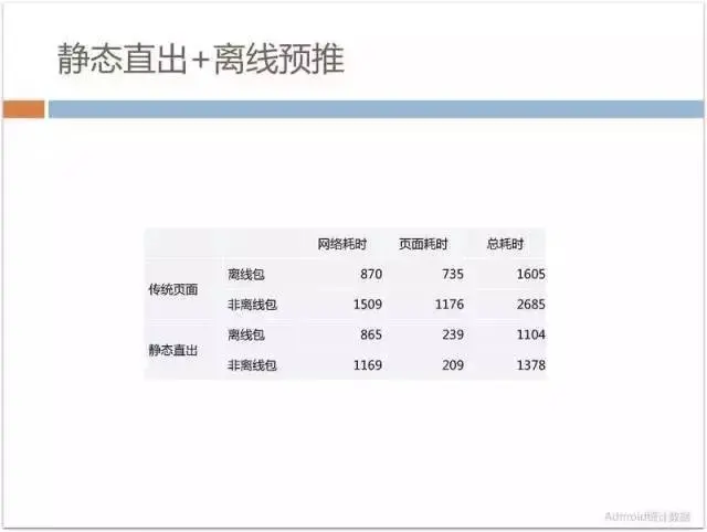 做了这个工作后我们采集了现网数据,静态直出和传统页面这两种模式对比非常明显。下图页面耗时部分,由于静态直出页面不需要任何JS执行,只需要WebView渲染,所以页面耗时静态直出相比传统页面降低了大概500毫秒到1秒左右。