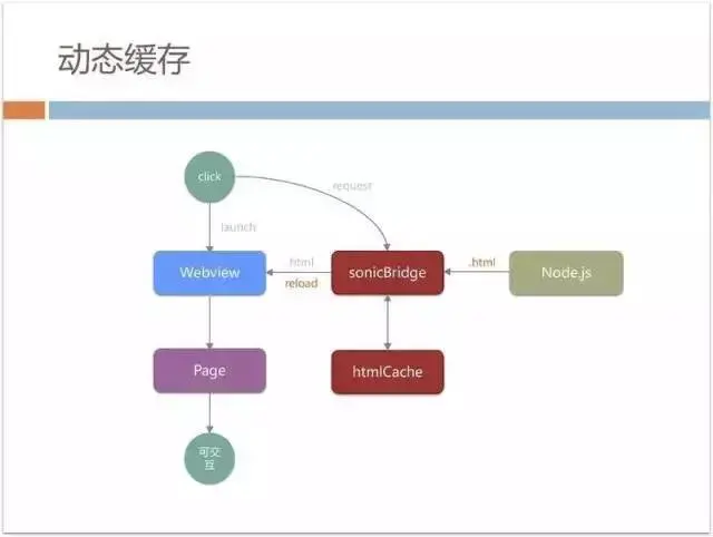 同样我们不让WebView直接访问我们的Node.js服务器,我们在这中间加上之前提到地类似offlineCache的中间层sonicBridge,这个中间层首先会从Node.js服务器下载完整的HTML给WebView,同时会把下载回来的内容在本地完整地做缓存。
