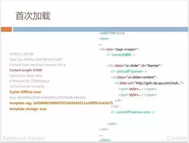 template是在首次访问的时候,根据sonicdiff里的id信息,把所有可变的数据剔除掉剩下的页面框架。用户二次打开时只要根据返回的数据,在客户端本地和template做merge拼接就可以得到完整的HTML。