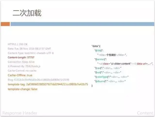 当第二次加载返回的数据就没有前面看到的整个HTML,只会返回大概37KB的数据,这个data实际上就是一个JSON,但它定义了前面对应例如sonicdiff-banner的DOM结构。为了节省H5中执行的代码,我们直接在JSON中把DOM节点代码拼好,这样页面只需要做id的匹配和刷新。