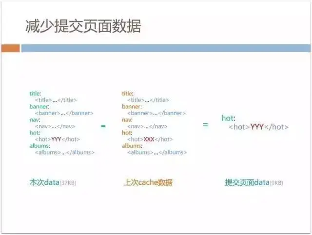 我们把每次的dataCache缓存下来后,对数据也做了差量,比如这一次请求返回的是37KB的数据,上次cache的也是37KB的数据,我们会判断内部真正变化的到底有多少,然后只把差量的部分交给HTML刷新,这样在大部分场景下我们的页面只需要处理大概9KB的数据就能刷新整个页面。