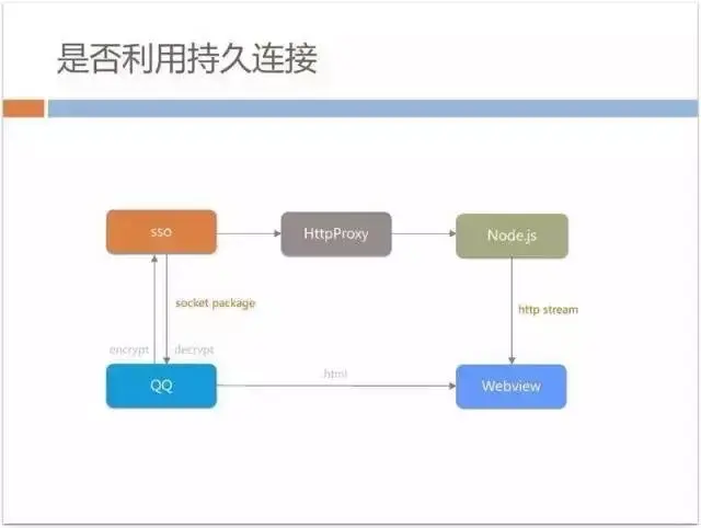 在做H5的提速优化时,大家很容易想到我们是否要利用持久连接去避免访问服务器的connect、DNS、握手之类的耗时,像QQ这种客户端它跟后台server是有持久化的连接的。假如用这个连接来向后台服务器请求HTML文件并交给WebView,会不会比临时建立一个connect请求更快呢?我们只需要搭一个反向代理服务就可以从QQ消息后台访问我们Node.js服务器,这个流程是可以打通,但是我们评估认为这种模式未必适合所有的场景。