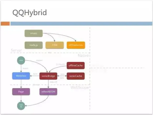 经过上述的介绍后,大家对QQHybrid可能有了大概直观的印象:1. 我们在WebScope的前端开发同学做了一部分工作;2. 我们的native层终端开发同学做了bridge桥接,3.我们后台的同学做了很多的自动集成和offlineServer推送等工作。该部分架构如下: