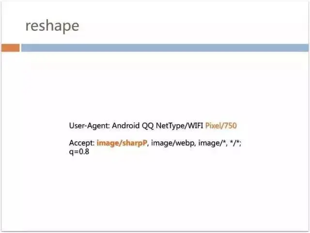 这个案例给了我们额外的启发。我们现网中,Pixel字段有三种取值:480px、640px、750px。我们内部讨论过是否可以把屏幕尺寸直接写在User-Aagent里,这样以后Android出了一些新的屏幕分辨率我们也能在后台做更好的自适应,为每种机型去生成不同格式的图片。