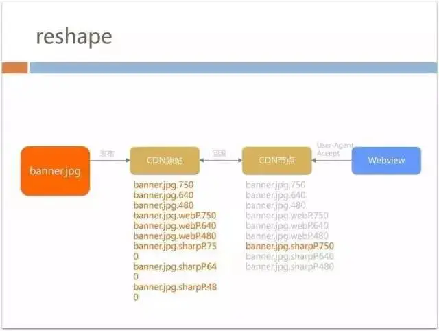 这种屏幕自适应的策略也面临近似私有格式的成本,因为CDN也不知道手机的情况,最后我们提出了reshape的架构,从图片下载完整的环节来看,大概可以分成4个层级: