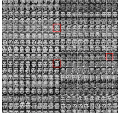 最后说说测试的结果,我仍然以整副olivettifaces.gif作为输入,得出其类别后,跟真正的label对比,程序输出被错分的那些图像,运行结果如下: