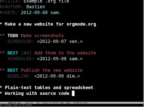 - 鉴于 Org mode 实在是太好用了,所以再单独推荐一次。Org mode 是基于节点的结构,利用它可以实现脑图的功能,而且还可以设置每个节点的状态。大多数人(包括我)都是将它作为 GTD 工具来使用,或者可以用来写博客文章。