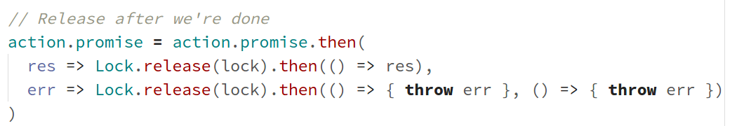 在动笔时,Promise.prototype.finally() 是 8 个 TC39 第四阶段提案 之一。这意味着 finally() 将和 7 个其他新语言特性一起加入 Node.js。 finally() 是这 8 个新特性中最令人兴奋的之一,皆因为它可以让异步操作结束后的清理更彻底。举个例子,下面我正用在生产环境的代码非常需要