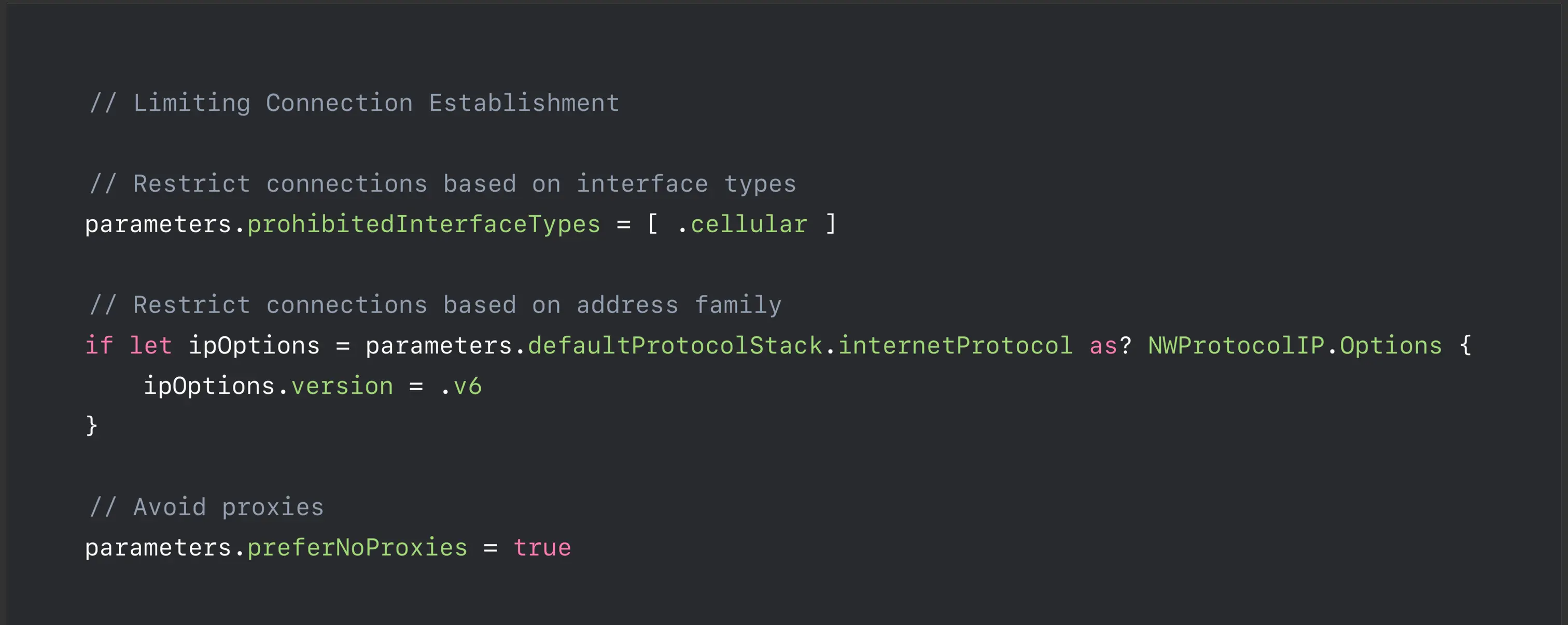 而使用 Network.framework ,你可以十分简单的对网络路径进行配置,比如下面的例子中,指定了仅使用蜂窝网络、使用 IPv6 协议、与禁止代理。都仅是一行命令就完成了。特别当你需要为特定连接指定连接方式时,这个框架能极大提高你的效率。