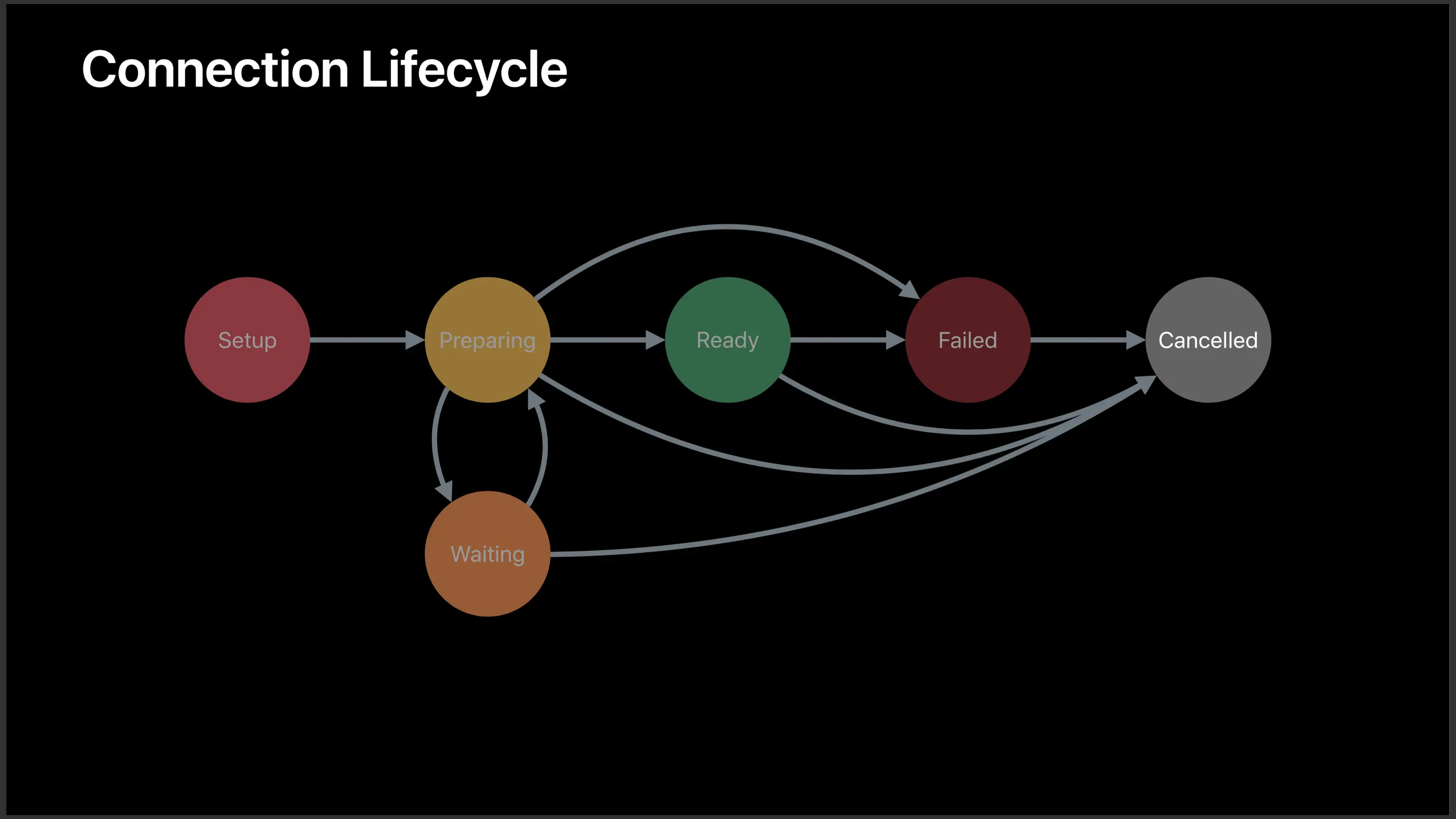 在准备完毕以后,连接可能进入 等待 、就绪 或 失败 状态。当然在你取消连接时也会进入 取消 状态。