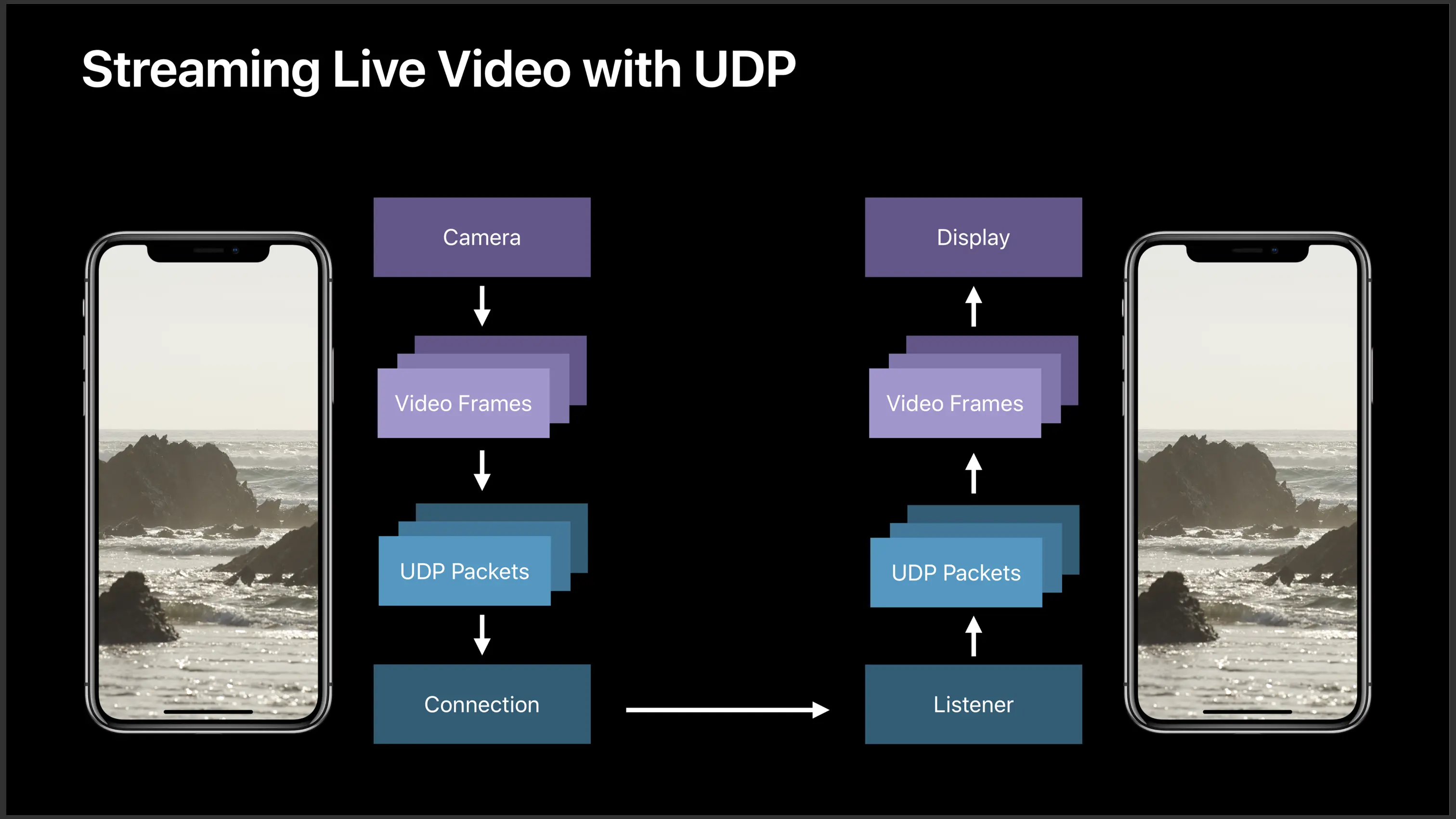 该案例使用 UDP 进行视频的实时传输,出于简化考虑,并未对视频帧做任何编码,直接把裸数据封包,并通过 UDP 传输。在接收端,解包数据并重新封装为视频帧,直接进行播放。案例中也使用了 Bonjour 服务来进行快速设备配对连接。