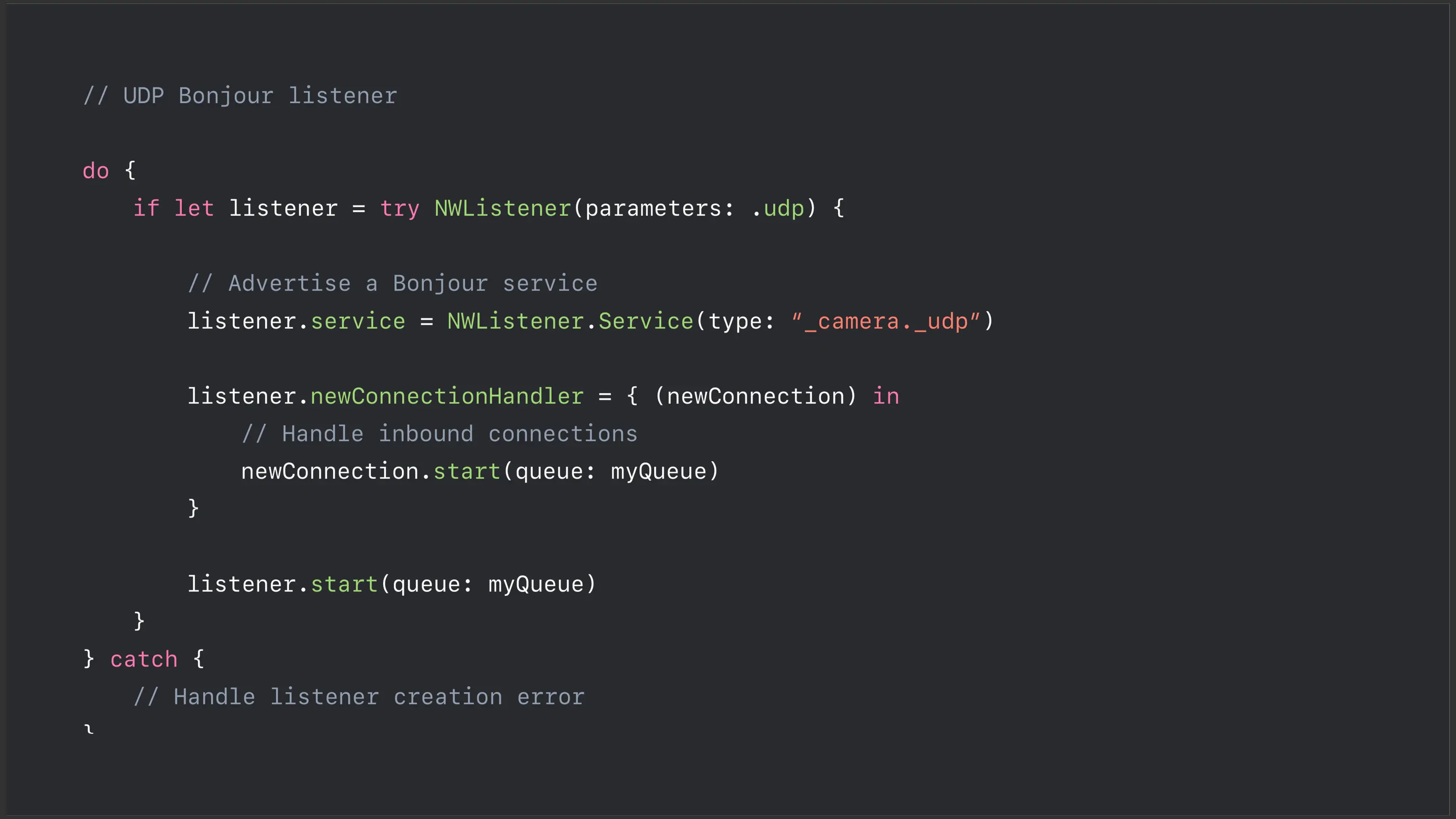 在监听端的代码异常简单,甚至连 Bonjour 服务也已经整合好了。你要做的仅仅是指定 .udp 并指定正确的 Bonjour 服务名称。