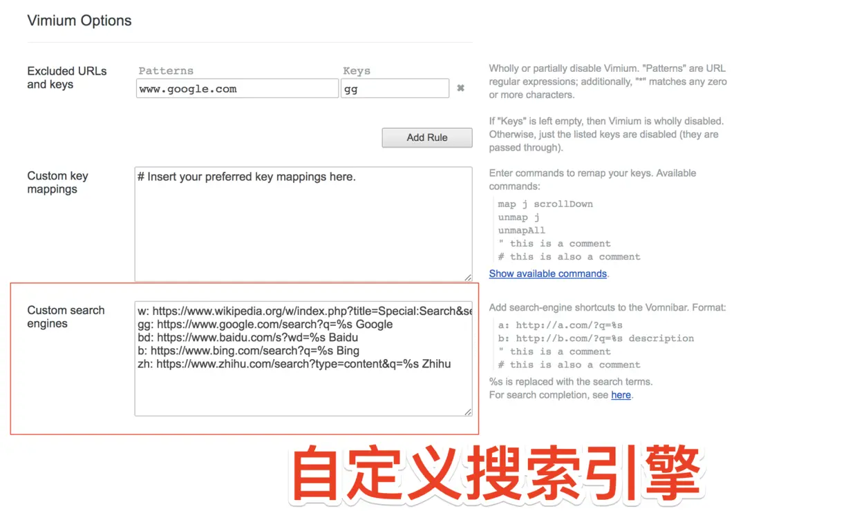 快速搜索的好用之处在于, 可以定义无限的数量的搜索引擎(下面贡献出我常用的配置 维基, 谷歌, 百度, 必应, 知乎)