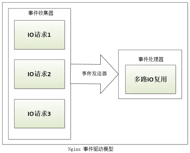 如上图所示,Nginx 的事件驱动模型由事件收集器、事件发送器和事件处理器三部分基本单元组成。其中,事件收集器负责收集 worker 进程的各种 IO 请求,事件发送器负责将 IO 事件发送到事件处理器,而事件处理器负责各种事件的响应工作。