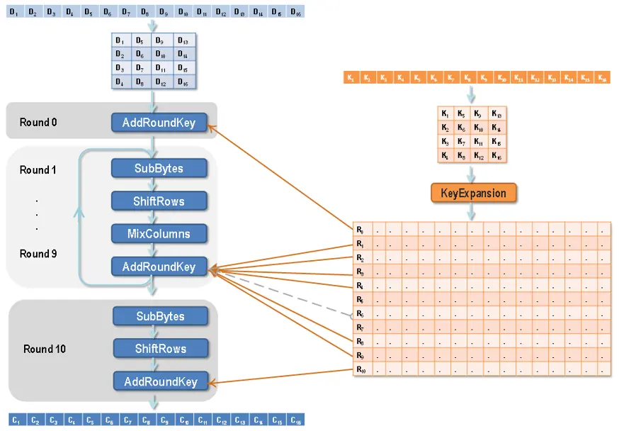 Rijndael算法是基于代换-置换网络(SPN,Substitution-permutation network)的迭代算法。明文数据经过多轮次的转换后方能生成密文,每个轮次的转换操作由轮函数定义。轮函数任务就是根据密钥编排序列(即轮密码)对数据进行不同的代换及置换等操作。