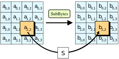 字节代换(SubBytes)是对state矩阵中的每一个独立元素于置换盒(Substitution-box,S盒)中进行查找并以此替换输入状态的操作。字节代换是可逆的非线性变换,也是AES运算组中唯一的非线性变换。字节代换逆操作也是通过逆向置换盒的查找及替换来完成的,主要功能是通过S盒完成一个字节到另外一个字节的映射。