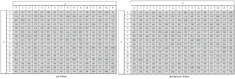 S盒是由一个有限域GF(256)上的乘法求逆并串联线性仿射变换所构造出来的,不是一个随意构造的简单查询表。S因其运算复杂,众多的AES 软件及硬件实现直接使用了查找表(LUP, Look-up table),但查询表的方式并不适合所有场景,针对特定的硬件最小化面积设计需求,则要采用优化的组合逻辑以得到同价的S盒替换。盒是事先设计好的16×16的查询表,即256个元素。S盒用于提供密码算法的混淆性。S盒的详细构造方法可以参考文献。这里直接给出构造好的结果,下图(a)为S盒,图(b)为S-1(S盒的逆)。S和S-1分别为16×16的矩阵,完成一个8比特输入到8比特输出的映射,输入的高4-bit对应的值作为行标,低4-bit对应的值作为列标。