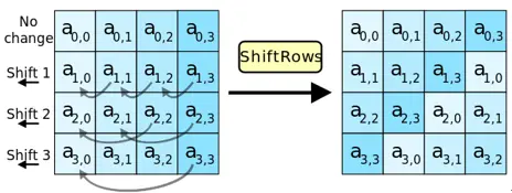 行移位主要目的是实现字节在每一行的扩散,属于线性变换。行移位是一个4×4的矩阵内部字节之间的置换,用于提供算法的扩散性。