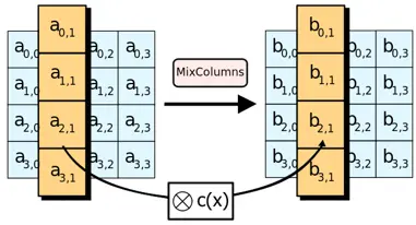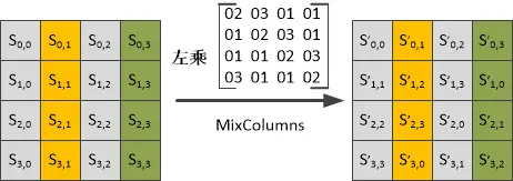 列混合是通过将state矩阵与常矩阵C相乘以达成在列上的扩散,属于代替变换。列混合是Rijndael算法中最复杂的一步,其实质是在有限域GF(256)上的多项式乘法运算。