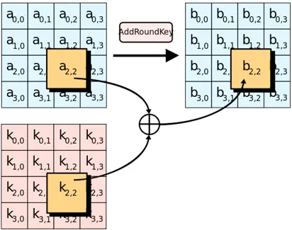 密钥加是将轮密钥简单地与状态进行逐比特异或。这个操作相对简单,其依据的原理是“任何数和自身的异或结果为0”。加密过程中,每轮的输入与轮子密钥异或一次;因此,解密时再异或上该轮的轮子密钥即可恢复。
